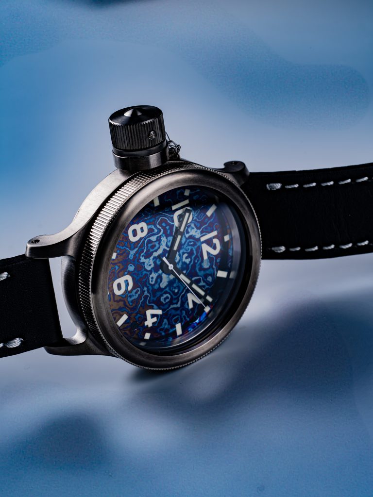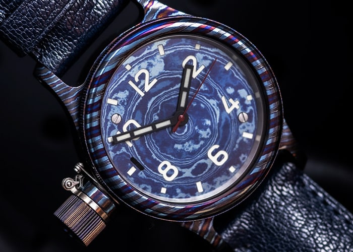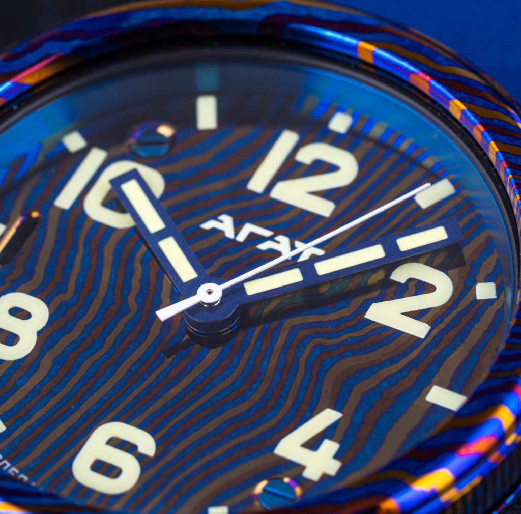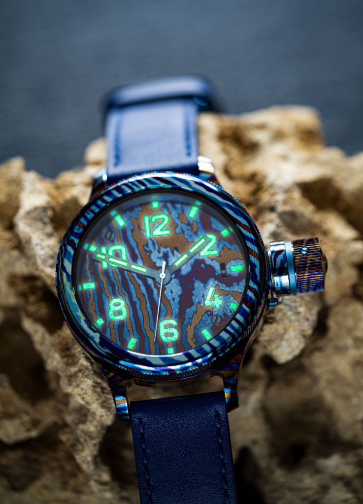 Как и при работе со сталью, здесь берутся листы металла, но не стальные, а из титановых сплавов, имеющих различное содержание титана и дополнительных элементов. Слои нагреваются, многократно проковываются, пока в результате не получается единый брусок металла. Из него вырезается и тщательно полируется корпус будущих часов. Затем поверхность подвергается термической обработке, и начинается волшебство. В зависимости от доли титана и от состава дополнительных химических элементов в сплаве, он по-разному реагирует на нагрев. И в рисунке с характерными дамасскими разводами каждый из слоев внезапно приобретает свой цвет, от светло-желтого и оранжево-красного до фиолетового.